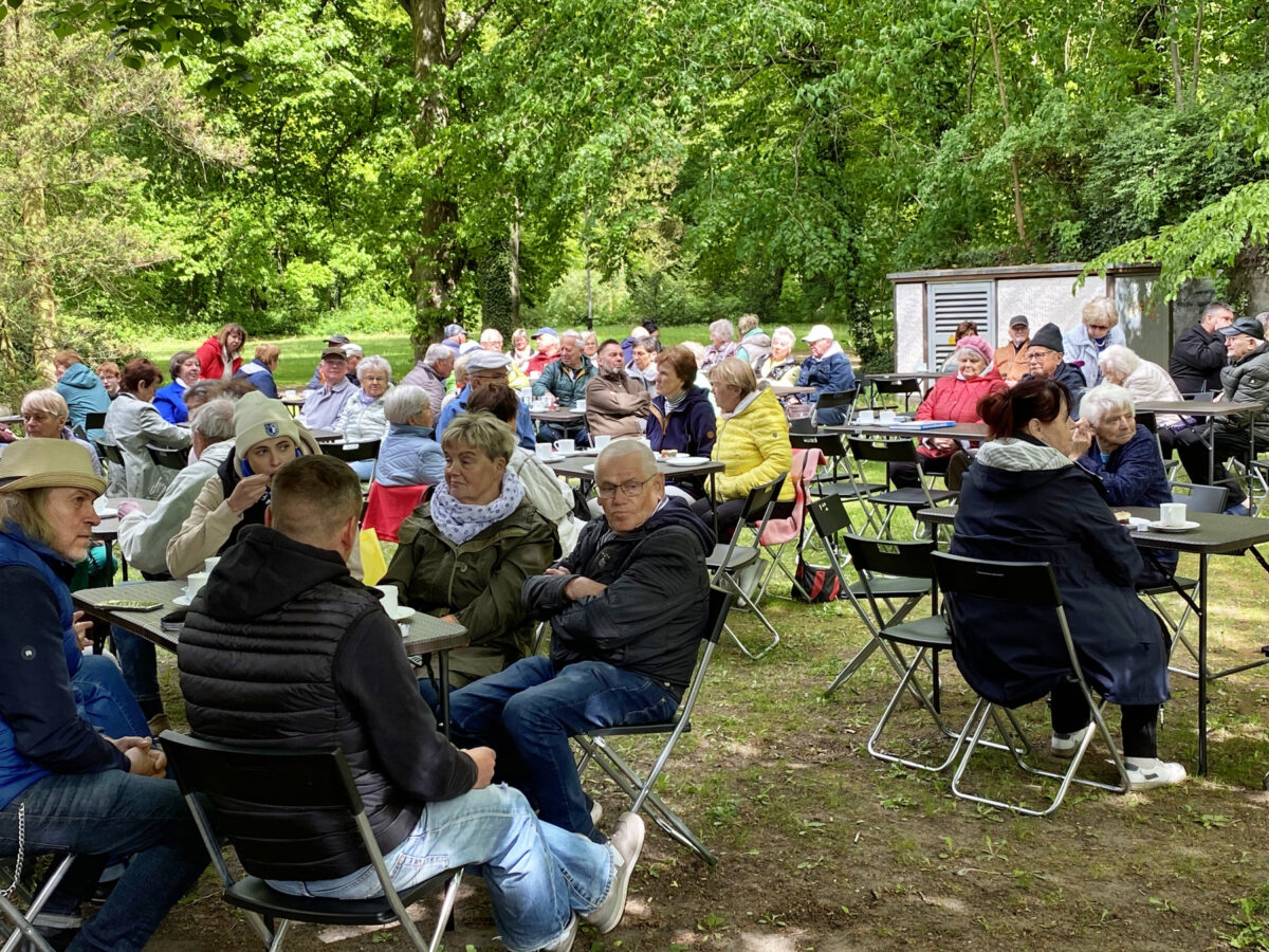 Nach deftiger Brotzeit mit Hackepeter und Schmalz wurden angeregte Gespräche geführt, bei denen auch immer Themen aus unserer Einheitsgemeinde und zur Parkanlage mit dem Neuen Schloss von großem Interesse sind.