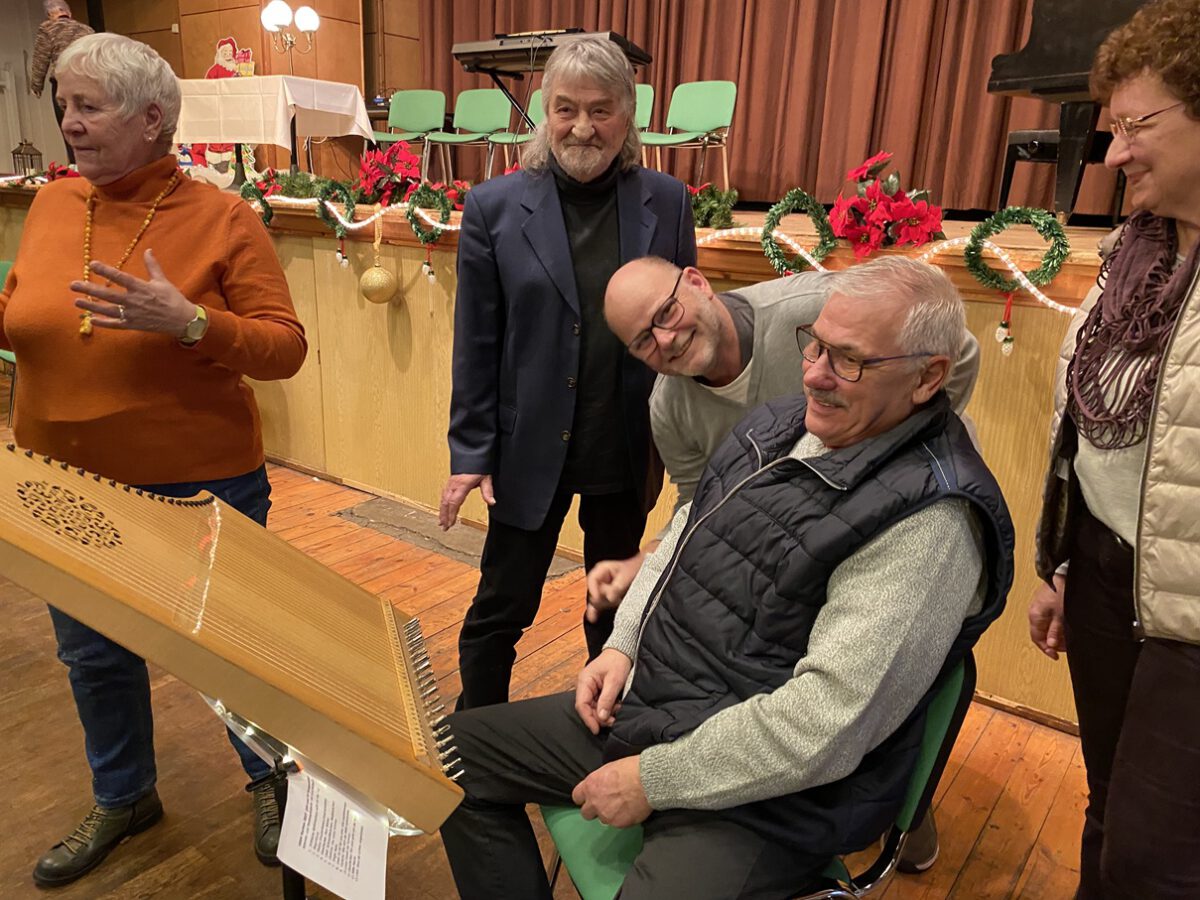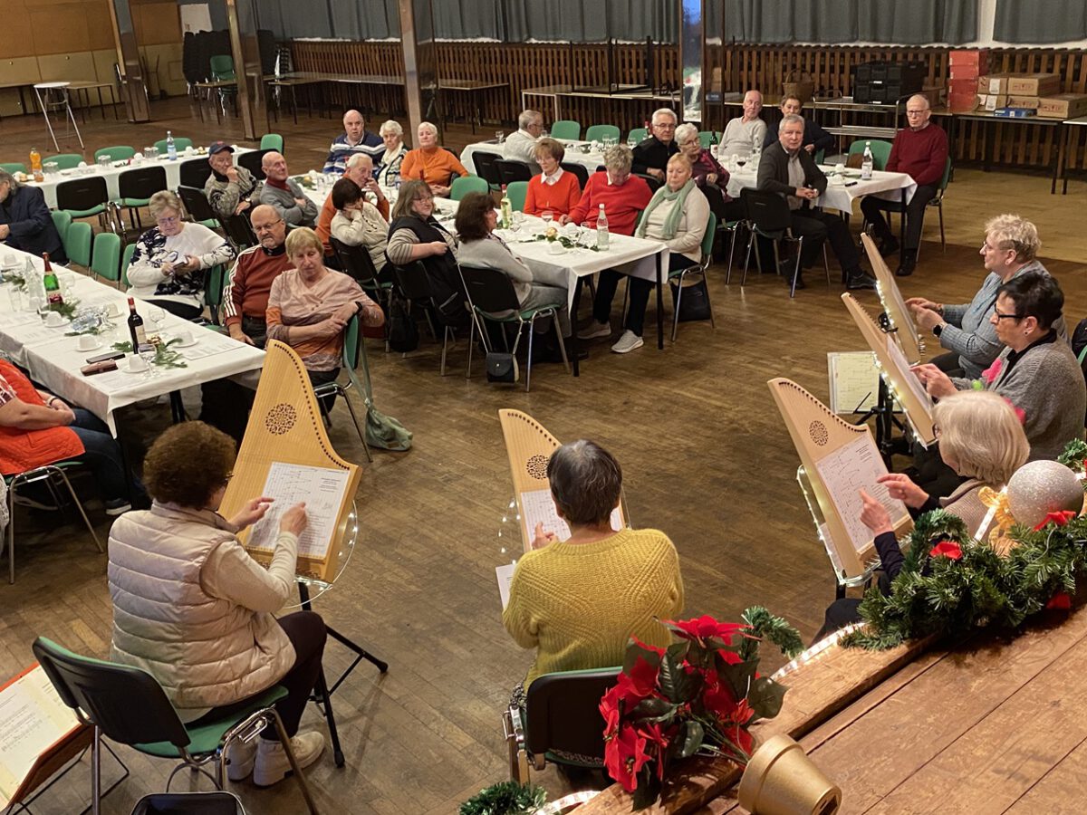 Es gab in diesem Jahr auch Neues im Programm. So beeindruckten die Damen des Veeh-Harfen-Ensembles Tangerhütte mit dem zauberhaften Klang ihrer weihnachtlich beleuchteten Instrumente, wozu nicht zuletzt auch die hervorragende Akustik des Saales beitrug. Kerstin Lagnaese erläuterte die Geschichte des Zupfinstruments, das Ende der 1980er Jahre vom Gülchsheimer Landwirt Hermann Veeh aus der Akkordzither entwickelt wurde. Dazu konzipierte er eine entsprechende Notenschrift, um seinen mit dem Down-Syndrom geborenen Sohn Andreas das Musizieren zu ermöglichen.